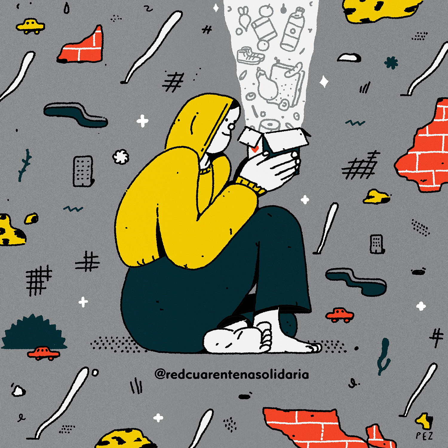 Illustration for RedCuarentenaSolidaria, a campaign aimed at connecting those staying at home with stores that are still open in order to safely provide them with donations to distribute among the homeless.